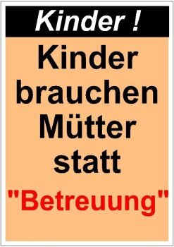 Begriffe wie "Mutterrolle" werden als "Angriff auf die Gleichberechtigung" bekämpft; Begriffe wie "Selbstverwirklichung" und "Karriere" sollen Sie ersetzen. Etwa 100.000 Kinder werden jedes Jahr alleine in Deutschland abgetrieben, christliche Tugenden wie "du sollst nicht töten" werden ersetzt durch "mein Bauch gehört mir". Etwa dieselbe Anzahl Kinder werden vom Staat jährlich in Obhut genommen... die Liste wäre beliebig erweiterbar.